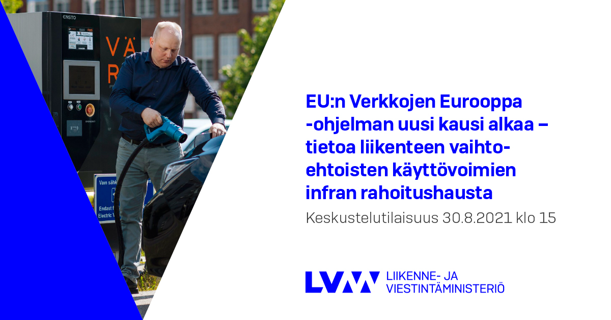 Siirtymä vähäpäästöiseen liikenteeseen edellyttää kattavaa vaihtoehtoisten käyttövoimien jakeluinfrastruktuuria. EU rahoittaa infran rakentamista, kun Verkkojen Eurooppa -ohjelman toinen kausi alkaa syyskuussa. Jakeluinfran kehittäminen on myös Suomen fossiilittoman liikenteen tiekartan keskeinen toimi. Liikenne- ja viestintäministeriö järjestää rahoituksesta keskustelu- ja infotilaisuuden 30.8.2021.