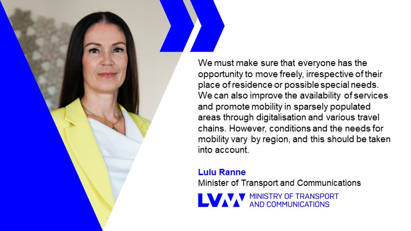 “We must make sure that everyone has the opportunity to move freely, irrespective of their place of residence or possible special needs. We can also improve the availability of services and promote mobility in sparsely populated areas through digitalisation and various travel chains. However, conditions and the needs for mobility vary by region, and this should be taken into account. The cost of mobility must not exclude people or impair the operating conditions for businesses,” says Minister of Transport and Communications Lulu Ranne.