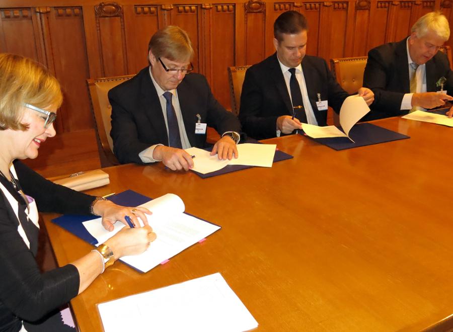Kuvassa sopimusta allekirjoittamassa liikenne- ja kuntaministeri Paula Risikko, Finavian toimitusjohtaja Kari Savolainen, Lappeenrannan kaupunginjohtaja Kimmo Jarva ja maakuntajohtaja Matti Viialainen Etelä-Karjalan liitosta.