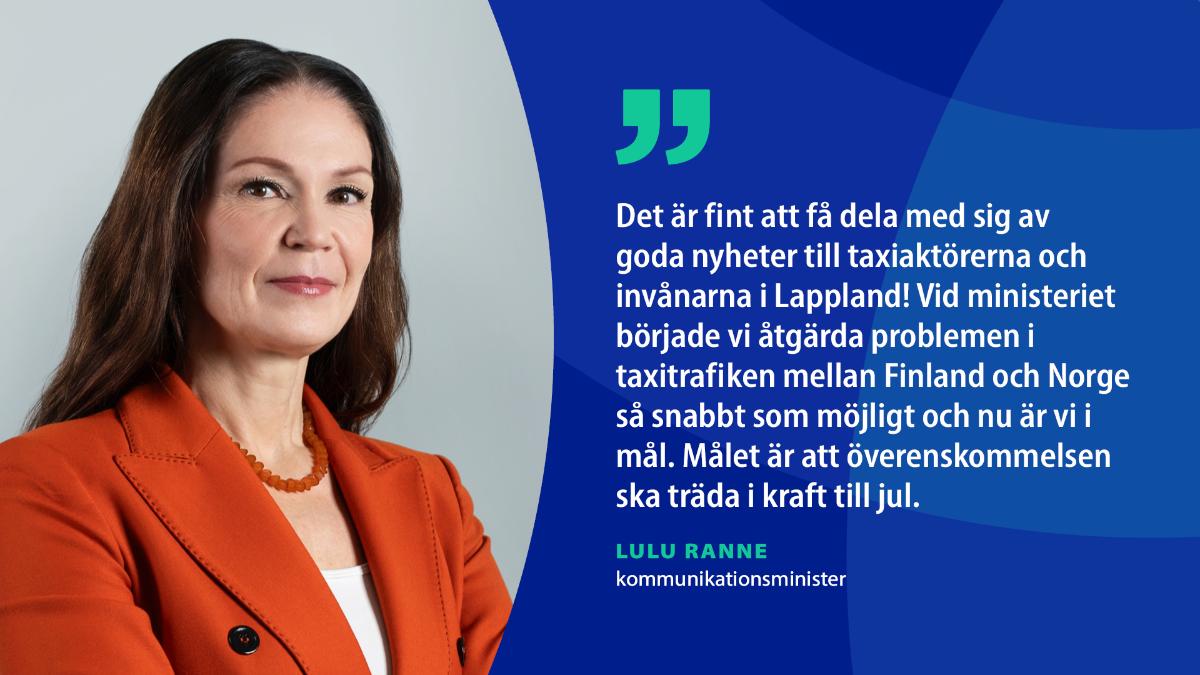 - Det är fint att få dela med sig av goda nyheter till taxiaktörerna och invånarna i Lappland! Vid ministeriet började vi åtgärda problemen i taxitrafiken mellan Finland och Norge så snabbt som möjligt och nu är vi i mål. Målet är att överenskommelsen ska träda i kraft till jul. I fortsättningen åker finländska taxibilar smidigt över gränsen, och vårt samarbete med Norge intensifieras ytterligare, säger kommunikationsminister Lulu Ranne.