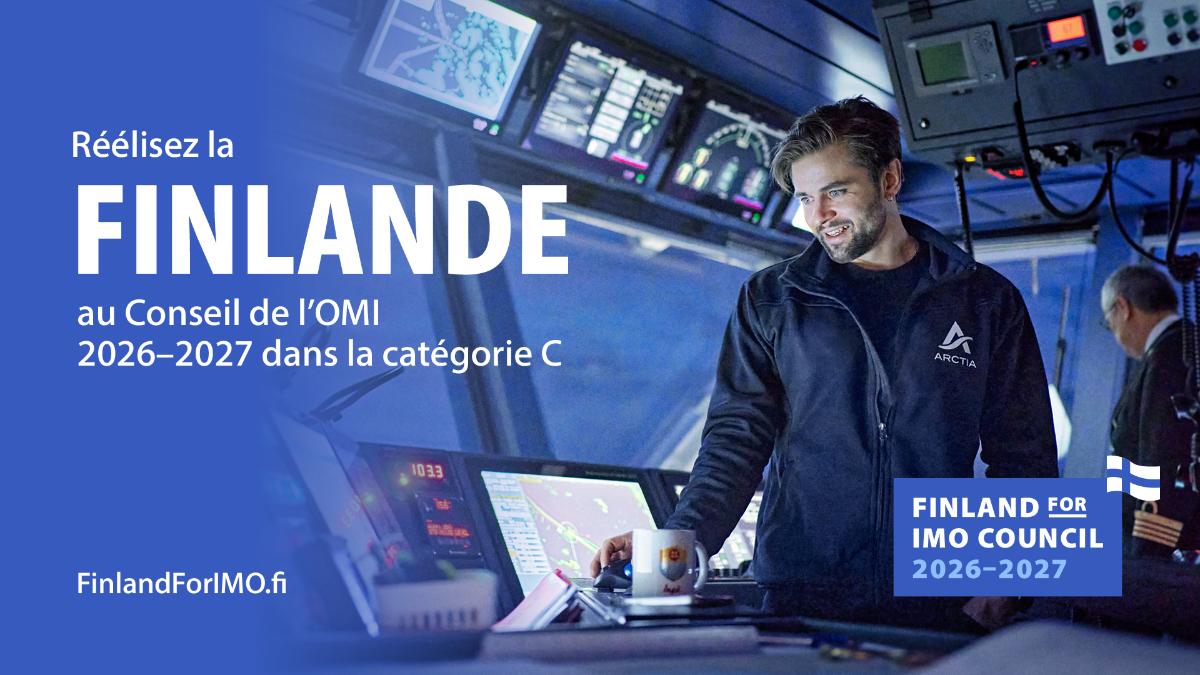 La Finlande est membre du Conseil de l’Organisation maritime internationale (OMI) pour la période 2024-2025. L’OMI est chargée des questions clés pour assurer la sécurité, la durabilité des transports maritimes, et pour trouver des solutions technologiques ; pour cette raison, la Finlande souhaite poursuivre son mandat pour la période 2026–2027.