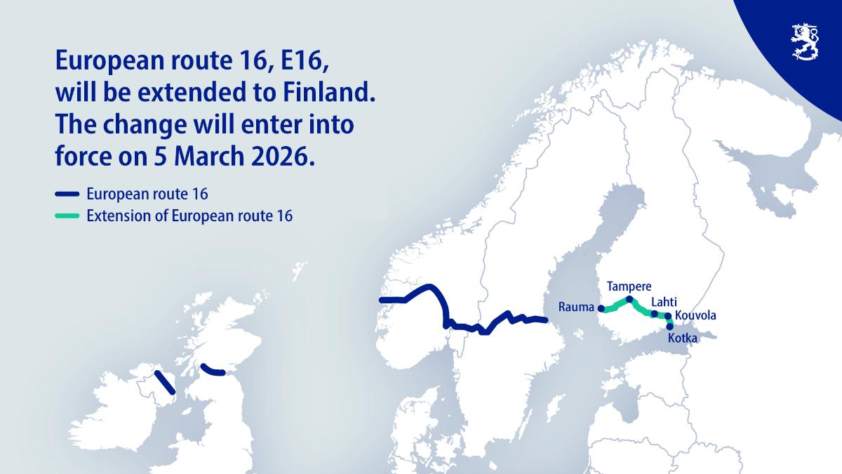 European route 16, E16, will be extended to Finland. The Finnish Government gave a decree on the matter on 5 February 2026. The decree will enter into force on 5 March 2026.