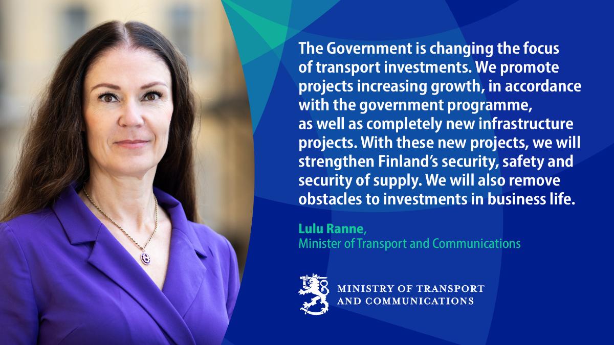 "The Government is changing the focus of transport investments. We promote projects increasing growth, in accordance with the government programme, as well as completely new infrastructure projects. With these new projects, we will strengthen Finland’s security, safety and security of supply. We will also remove obstacles to investments in business life. The Government is creating conditions for healthy growth,” says Minister of Transport and Communications Lulu Ranne.