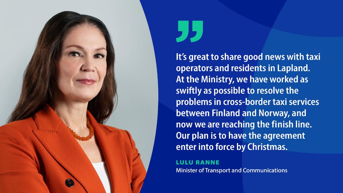 “It’s great to share good news with taxi operators and residents in Lapland. At the Ministry, we have worked as swiftly as possible to resolve the problems in cross-border taxi services between Finland and Norway, and now we are reaching the finish line. Our plan is to have the agreement enter into force by Christmas. In future, Finnish taxis will be able to cross the border with ease, and our cooperation with Norway will become even closer,” says Minister of Transport and Communications Lulu Ranne.
