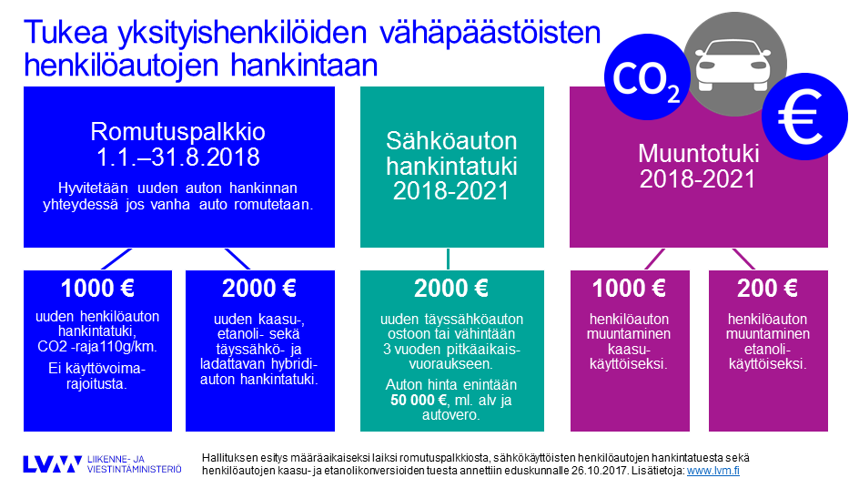 Hallitus antoi eduskunnalle esityksen laiksi henkilöautojen romutuspalkkiosta ja sähkökäyttöisten henkilöautojen hankintatuesta sekä henkilöautojen kaasu- tai etanolikäyttöisiksi muuntamisen tuesta 26. lokakuuta. Lain on tarkoitus tulla voimaan 1. tammikuuta 2018 ja olla voimassa 31. joulukuuta 2021 asti. Romutuspalkkio olisi kuitenkin käytössä vain 31. elokuuta 2018 asti.