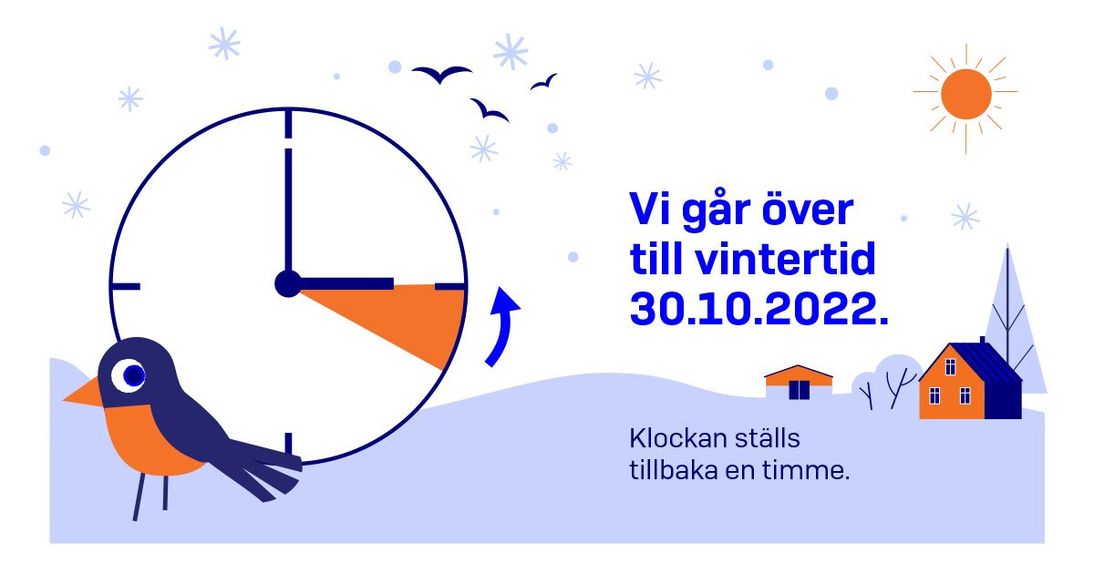 Sommaren är slut och vi går över till vintertid (normaltid) natten mellan lördag och söndag. Klockan ställs tillbaka en timme söndagen den 30 oktober 2022 klockan 4.00 på efternatten.