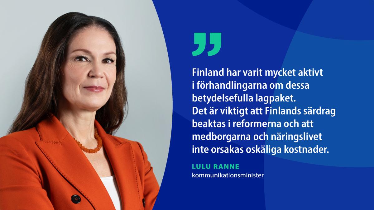– Finland har varit mycket aktivt i förhandlingarna om dessa betydelsefulla lagpaket. Det är viktigt att Finlands särdrag beaktas i reformerna och att medborgarna och näringslivet inte orsakas oskäliga kostnader, säger minister Ranne.