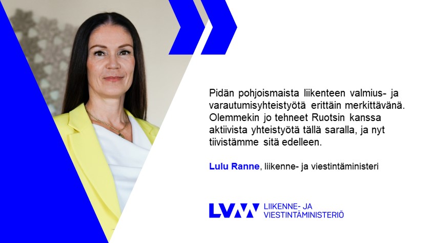 - Pidän pohjoismaista liikenteen valmius- ja varautumisyhteistyötä erittäin merkittävänä. Olemmekin jo tehneet Ruotsin kanssa aktiivista yhteistyötä tällä saralla, ja nyt tiivistämme sitä edelleen, sanoo ministeri Ranne.