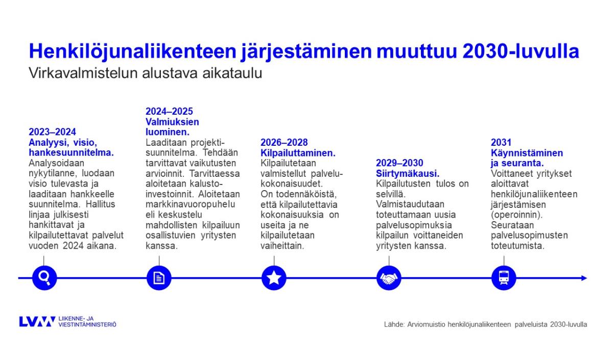 I en bedömningspromemoria, som utarbetats som tjänsteuppdrag, föreslås det att ordnandet av tjänster på 2030-talet ska beredas vid kommunikationsministeriet åren 2023–2025. Konkurrensutsättningen av persontrafiken ska genomföras 2026–2028. Den konkurrensutsatta trafiken kan då inledas 2031. Tidsramarna och faserna preciseras i takt med att projektet framskrider.