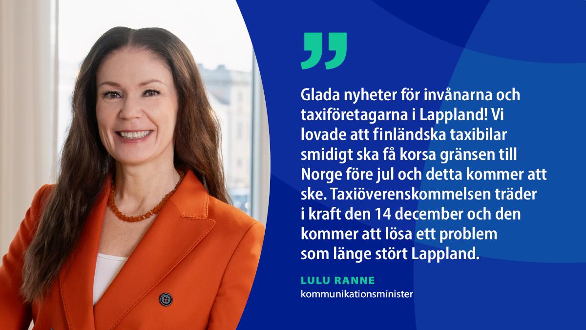 - Glada nyheter för invånarna och taxiföretagarna i Lappland! Vi lovade att finländska taxibilar smidigt ska få korsa gränsen till Norge före jul och detta kommer att ske. Taxiöverenskommelsen träder i kraft den 14 december och den kommer att lösa ett problem som länge stört Lappland, konstaterar kommunikationsminister Lulu Ranne.