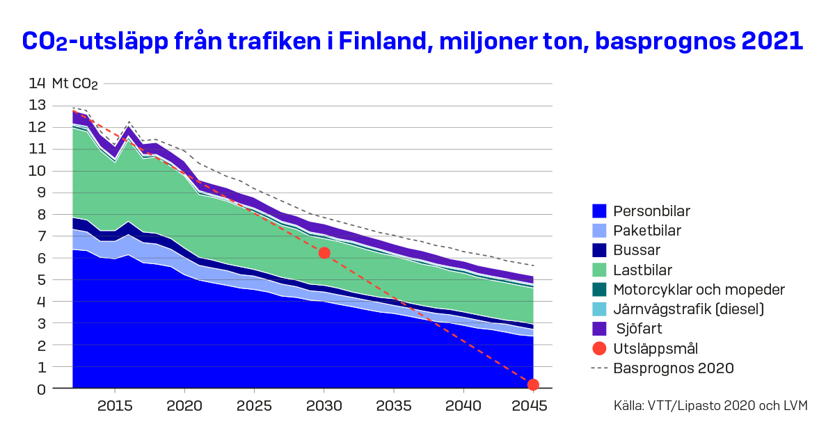 Koldioxidutsläppen från trafiken har minskat med cirka 1,6 megaton mellan 2005 och 2019. Enligt prognosen kommer utsläppen med nuvarande åtgärder att minska med ytterligare cirka 3,4 megaton fram till 2030. Detta innebär en utsläppsminskning på cirka 40 procent åren 2005-2030. År 2020 förutspåddes utsläppen minska med 37 procent. Den viktigaste orsaken till att utsläppen tros minska mer än beräknat är att trafiken i Finland nu förutspås elektrifieras snabbare än vad man tidigare trott.