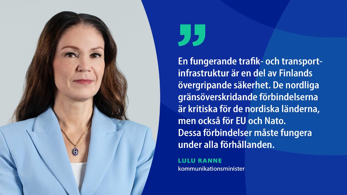 – En fungerande trafik- och transportinfrastruktur är en del av Finlands övergripande säkerhet. De nordliga gränsöverskridande förbindelserna är kritiska för de nordiska länderna, men också för EU och Nato. Dessa förbindelser måste fungera under alla förhållanden, konstaterar kommunikationsminister Lulu Ranne.
